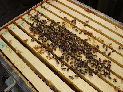Today I opened Bermuda to transfer the honey filled frames from the dead hive to it. I was pleased to see what looked like more bees in the hive just five days after checking on Wednesday. I replaced two empty frames with honey-filled ones. See my Wednesday, 2/28 post and you'll see that there are about twice as many bees on the tops of the frames today as there were on Wednesday - Hooray!