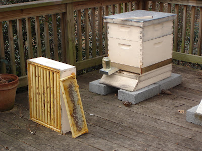 I then took the empty super off of the hive. There was some honey in it and some bees so I left it standing in front of Bermuda so that the bees could get the honey and return themselves to the hive. I left the one frame leaning against the shallow super - mostly because I couldn't find my hive tool today (note to self: BUY A SPARE ONE for these occasions) and it was hard to pry out the frames with a screwdriver! If the bees don't take the honey out of it by tomorrow, I'll put it in the freezer.This is the tale that began in 2006 in my first year of beekeeping in Atlanta, GA. ...there's still so much to learn.