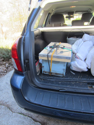 Julia strapped the hive together with her hive strap. And then we loaded it into Julia's car. It wasn't very heavy and although it looked like Julia, Noah and I were all carrying it, actually the two of them had all the weight so I let go to take this picture.
