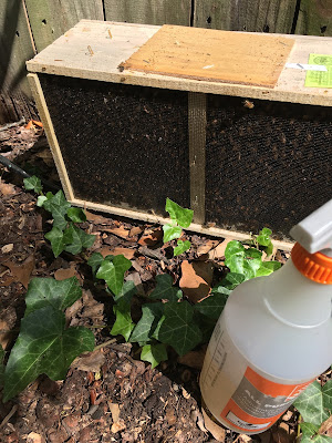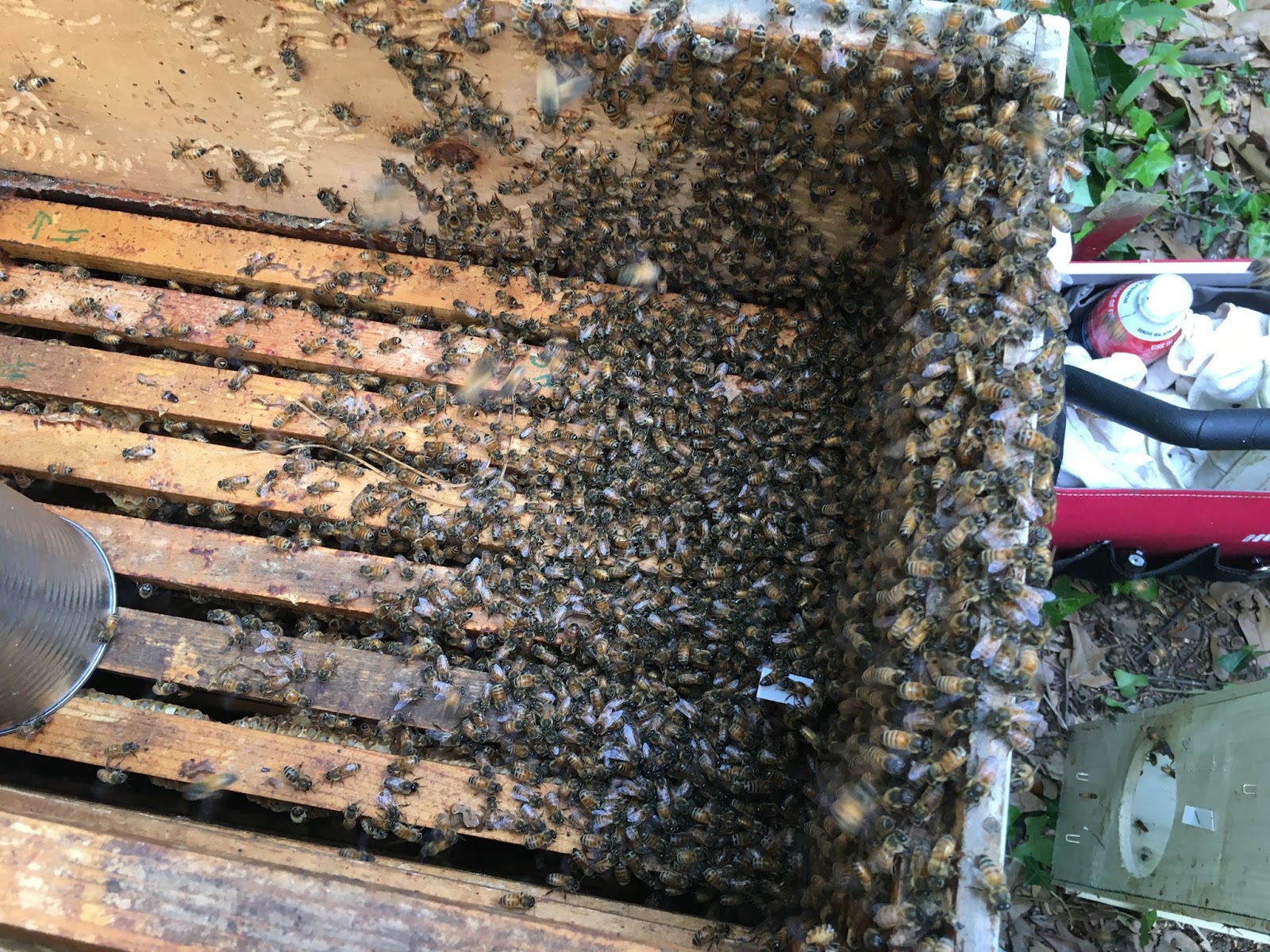 I opened the "observation hive" nuc that is there and it was filled with roaches and no bees. It makes sense. With both sides uncovered glass, it would have been way too hot and too light for bees in that box. I believe this was the observation hive's first year.