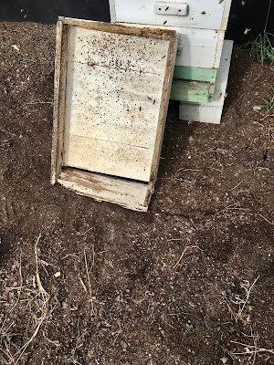 I put the rest of the hive back together - the inner cover and the top cover. Again, I had replaced the rotting bottom board with a screened bottom and a slatted rack. I leaned the bottom board over the entrance to allow the bees on the bottom board a way to climb onto the new hive. You can see the rot. I left the right side open because that was nearest to where the hive had been and I hoped they could smell the queen's pheromone better that way.