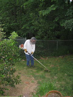 The first guy put this camping mosquito net I have over his head and proceeded to weed whack and blow off the backyard. He seemed somewhat reassured when I told him that bees don't really hear and that the loud noise wouldn't bother them. He should, however, try not to fling stuff into the front of the hive.