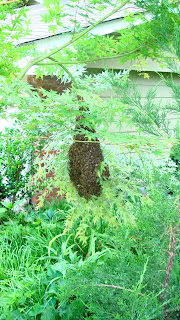 As my grandson (age 2) and I were shoveling chips from a tree removal and taking them in the wheelbarrow to put in my flower beds, I looked up and saw the swarm below hanging in a very young Japanese maple in my neighbor's yard.
