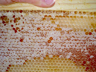 (Note: If you click on the image below to enlarge it, you can see bee eggs in the empty cells. The eggs look like grains of rice - the good news is the presence of those eggs means the queen is alive and laying - HOORAY!)