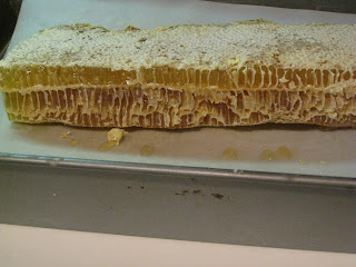 Below you can see a slice of the huge honeycomb from the double-wide comb. It was too fat to go into a cut comb box and frankly, wasn't pretty enough with its over-fat side of honey.